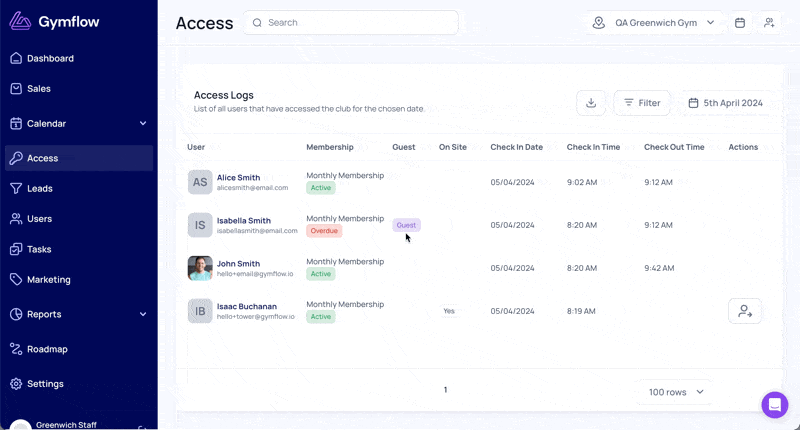 Check the access log to see who accessed the gym and when. Filter the results by a specific date range or membership.