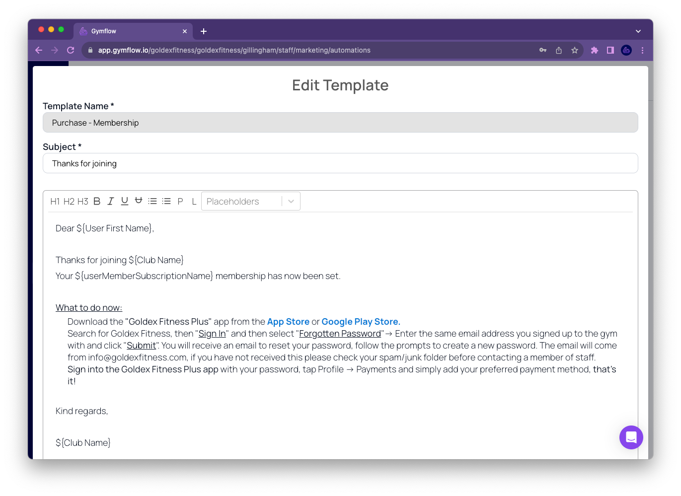 Click Edit to change the content of the message you wish to send. This will enable you to make the email more personalised to your business. You can use the list of placeholders in the template to personalise the email to each user.