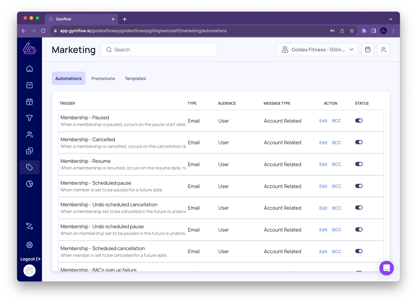 To manage your automated emails, navigate to Marketing > Automations. Here you will find a list of pre-defined automations that you can enable or disable, depending on your preferences. You can learn more about when the automation is triggered by reading the description of each trigger.