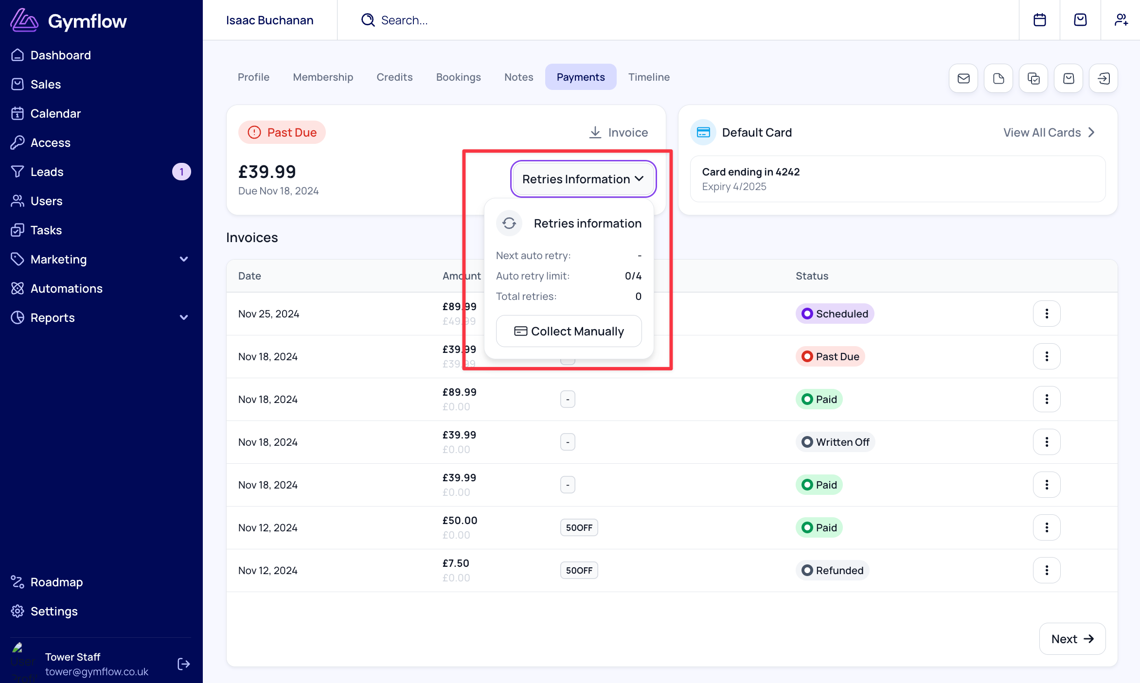 Gymflow will attempt to collect failed payments up to four times at intervals designed to avoid card blocking: