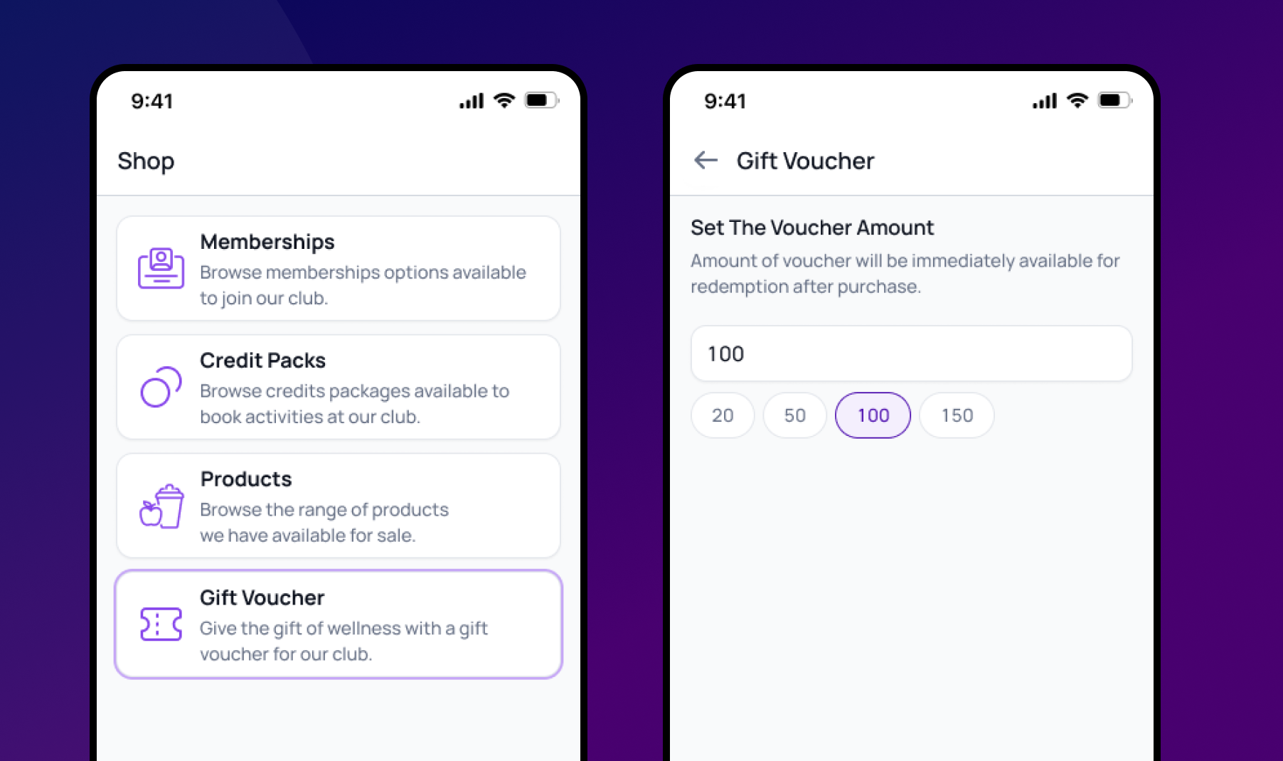 If Gift Vouchers are enabled for your club (see Enabling Gift Vouchers), members can buy them through the members app or your website, just like memberships and products.