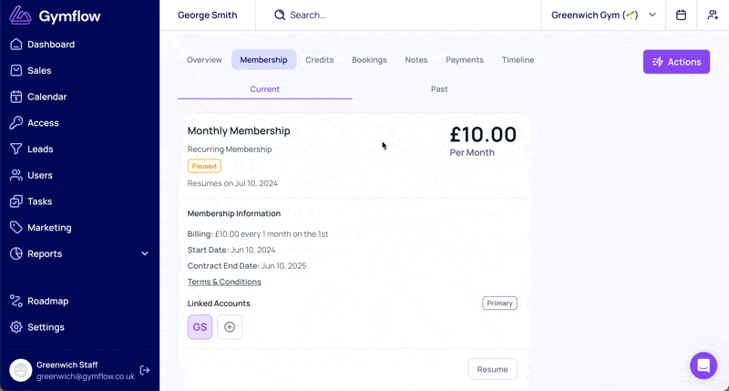 Once a membership has been paused, it will have an automatic resume date set. If you would like to resume the membership before this date, see the instructions below.