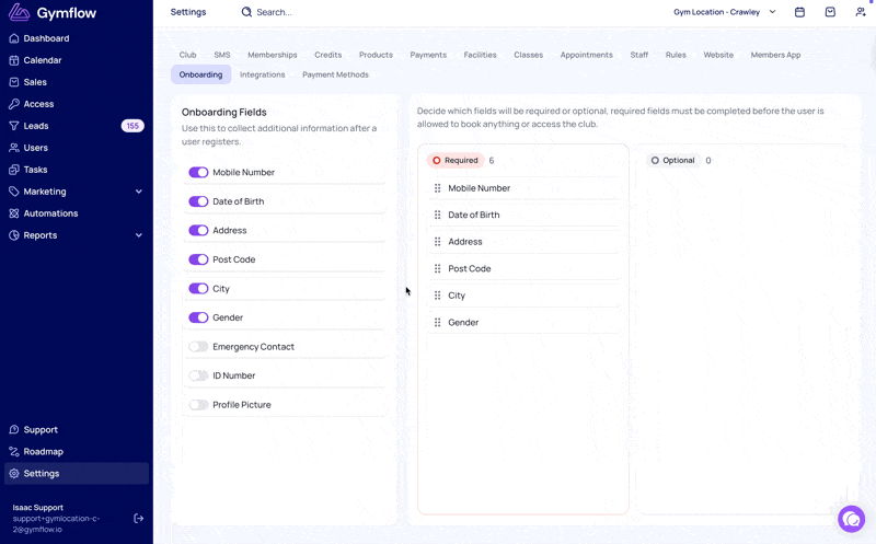 For existing customers of Gymflow, all Form fields that you previously had set up will automatically transfer to be “required” and in the Required section.